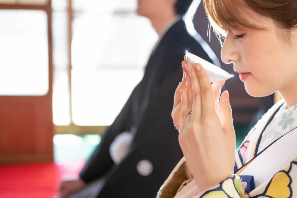 三々九度は三回に分けてお酒を飲む、家族の絆を固めるための儀式です。お酒が飲めない場合は飲むふりでも構いません。